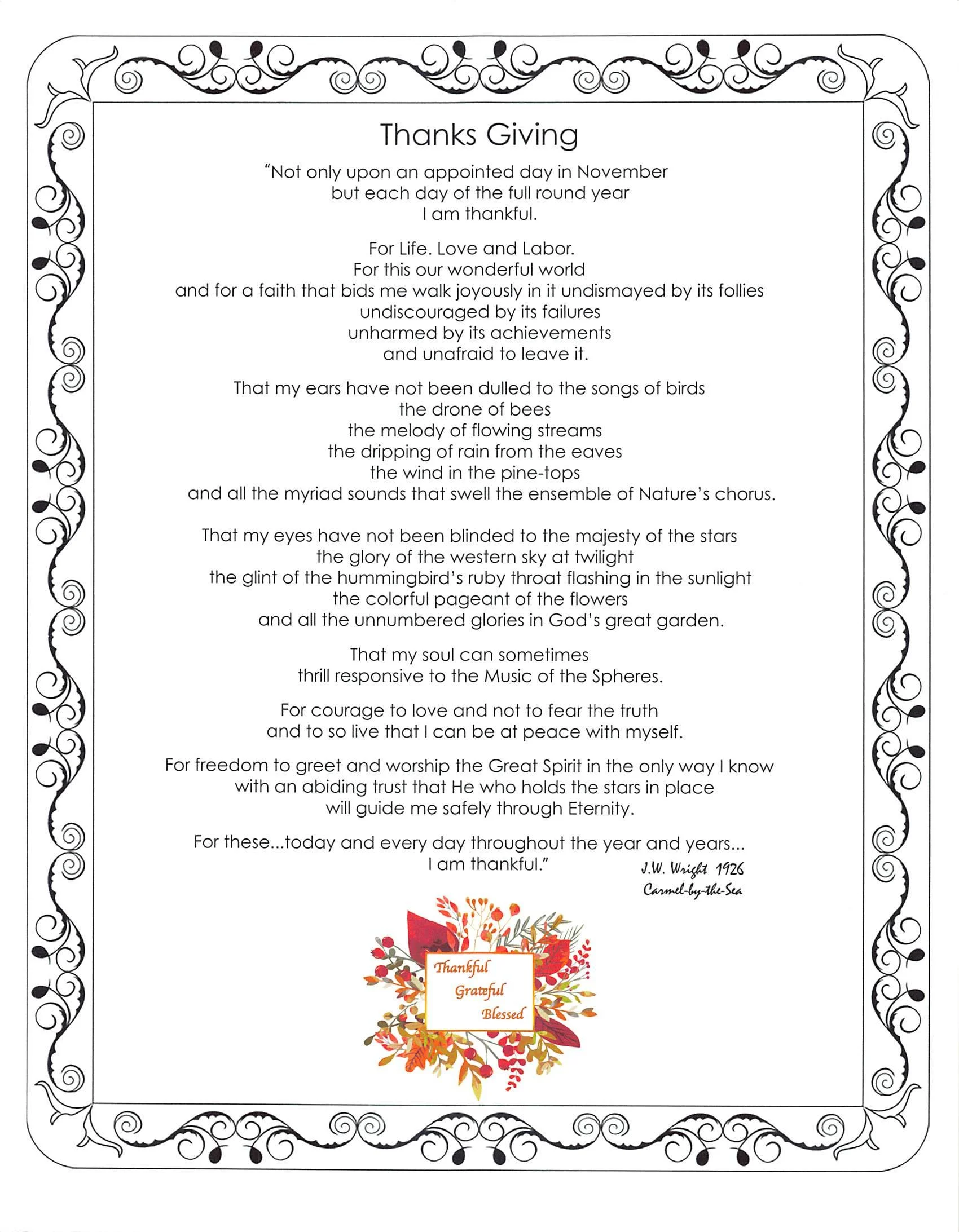 Included in this post is the complete poem, “Thanks Giving”, and a biography of J. W. Wright I found in in July 2020 edition of the Carmel Pine Cone. May this poem instill within you a heart of gratitude in this Thanksgiving season and in each of our remaining days.